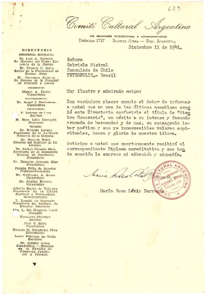 [Carta] 1941 dic. 11, Buenos Aires [a] Gabriela Mistral, Petrópolis, Brasil [manuscrito] María Rosa Létiz Barragán.