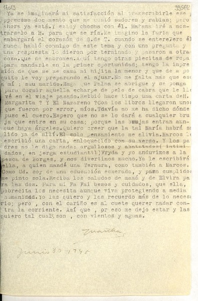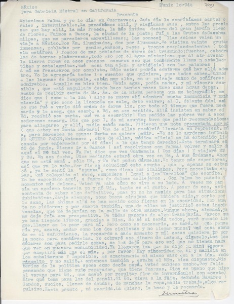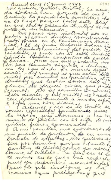 [Carta] 1944 jun. 1, Buenos Aires, [Argentina] [a] Gabriela Mistral, Rio, [Brasil] [manuscrito] Martha [Salotti].