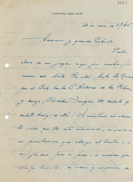 [Carta] 1945 ene. 4, Buenos Aires, [Argentina] [a] Gabriela [Mistral] [manuscrito] Clementina Isabel Azlor.