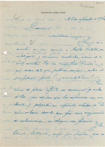 [Carta] 1944 sept. 25, Argentina [a] Gabriela Mistral [manuscrito] Clementina Isabel Azlor.