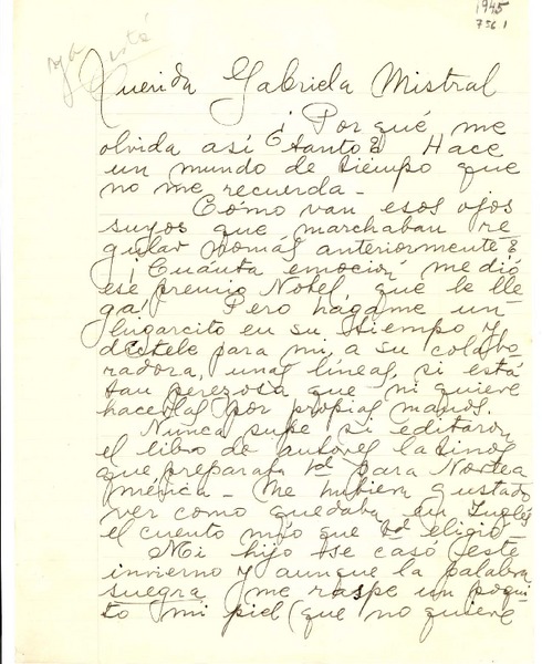 [Carta] [1945] [a] Gabriela Mistral [manuscrito] Hortensia Margarita [Raffo].