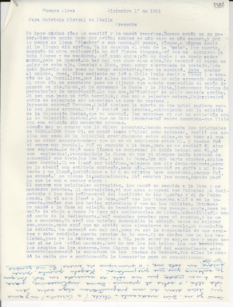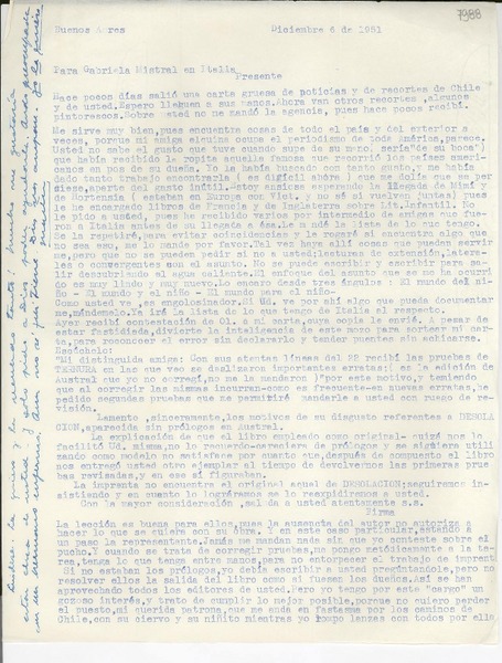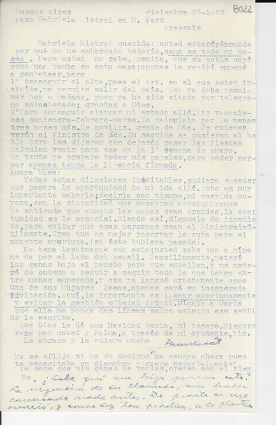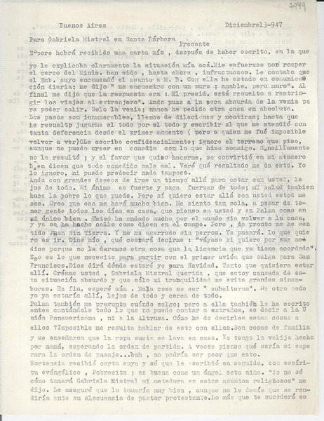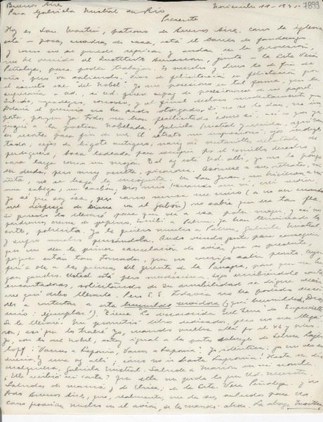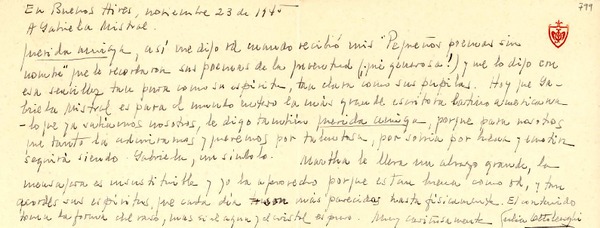 [Carta] 1943 nov. 22, Buenos Aires, [Argentina] [a] Gabriela Mistral, Río [de Janeiro, Brasil] [manuscrito] Martha A. Salotti.