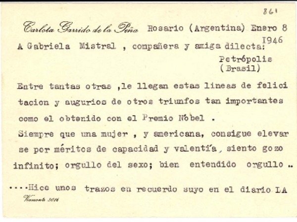[Tarjeta] 1946 ene. 8, Rosario, Argentina [a] Gabriela Mistral, Petrópolis, Brasil [manuscrito] Carlota Garrido de la Peña.