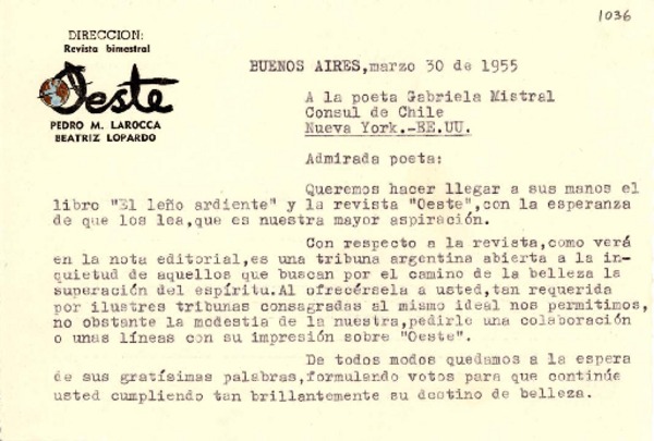 [Tarjeta] 1955 mar. 30, Buenos Aires, [Argentina] [a] Gabriela Mistral, Nueva York, [EE.UU.] [manuscrito] Beatriz Lopardo de Larocca.