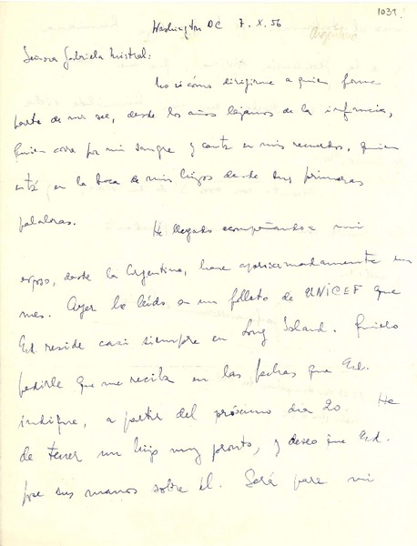 [Carta] 1956 oct. 7, Washington D.C., [EE.UU.] [a] Gabriela Mistral [manuscrito] Josefina Valderrama de Robinson.
