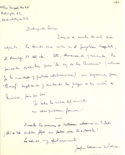 [Carta] 1956 oct. 20, Washington D.C. [a] Gabriela Mistral [manuscrito] Josefina Valderrama de Robinson.