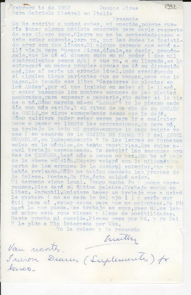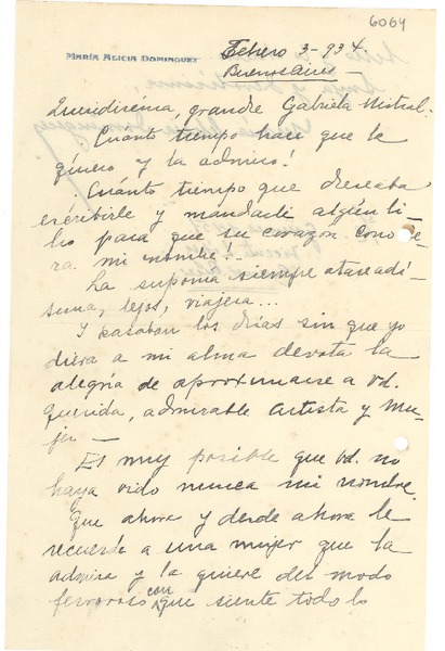 [Carta] 1934 feb. 3, Buenos Aires [a] Gabriela Mistral [manuscrito] María Alicia Domínguez.