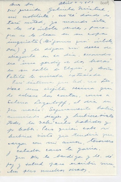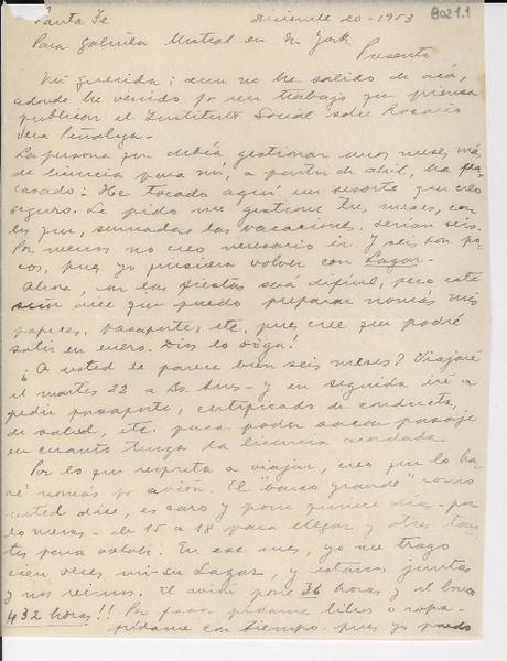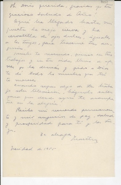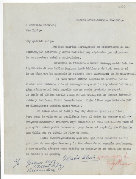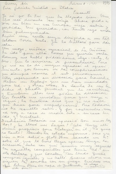 [Carta] 1955 feb. 3, Buenos Aires [a] Gabriela Mistral, New York [manuscrito] María Alicia Domínguez.