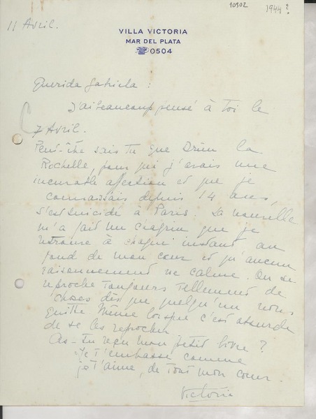[Carta] 1944 abr. 11, [Mar del Plata, Argentina] [a] Gabriela Mistral [manuscrito] Victoria Ocampo.