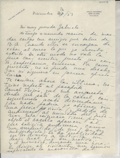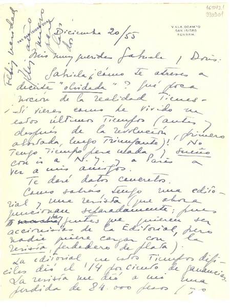 [Carta] 1955 dic. 20, [San Isidro, Argentina] [a] Mis muy queridas Gabriela y Doris [manuscrito] Victoria Ocampo.