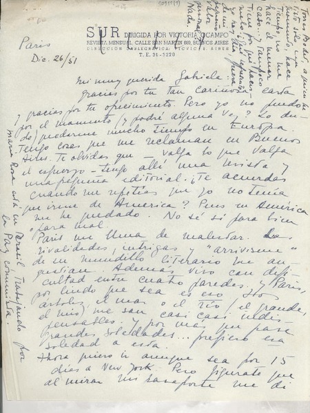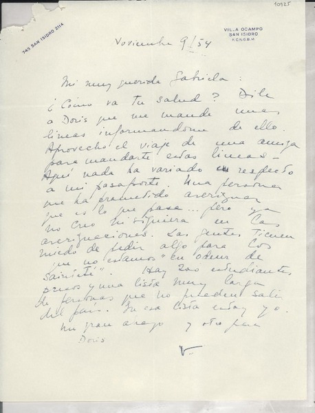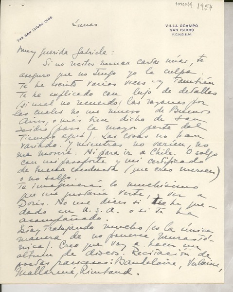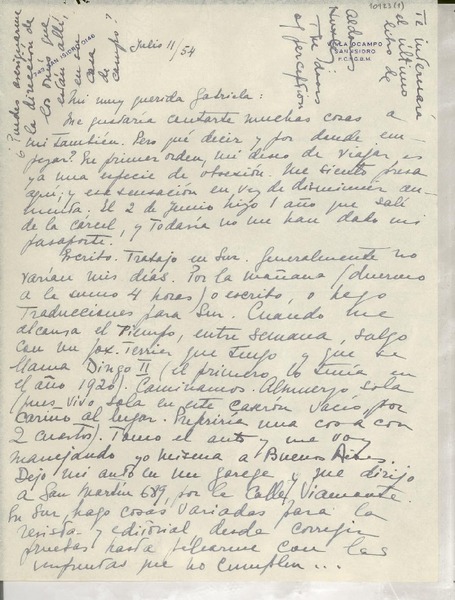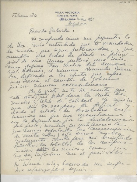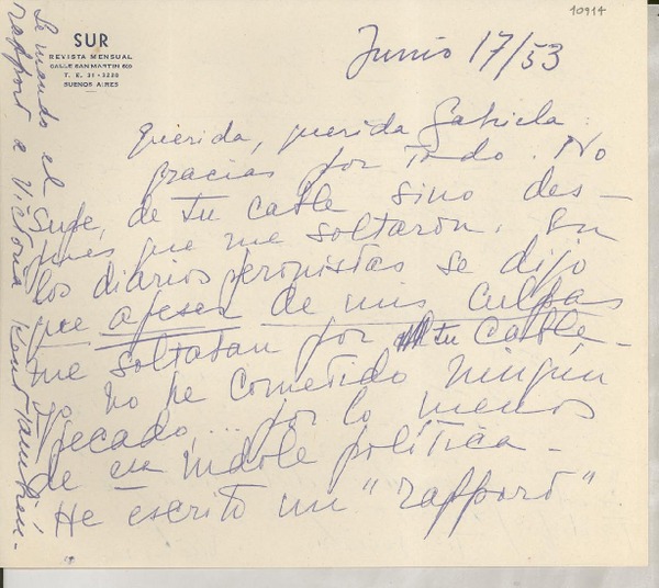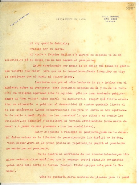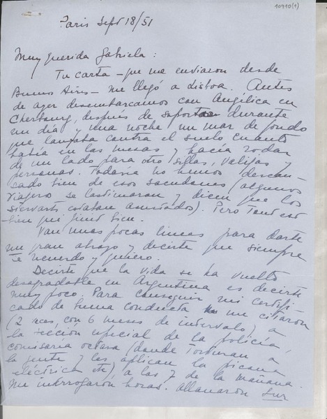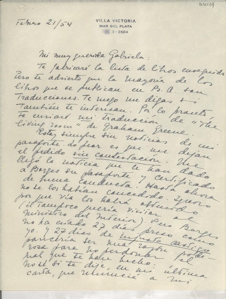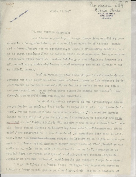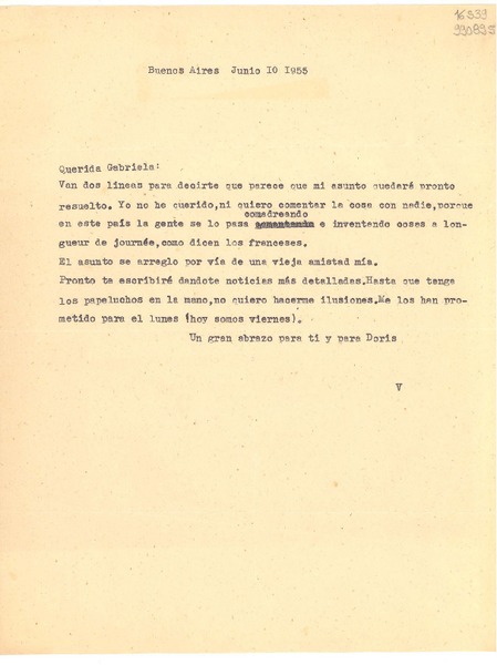 [Carta] 1955 jun. 10, Buenos Aires, [Argentina] [a] Querida Gabriela [manuscrito] Victoria Ocampo.