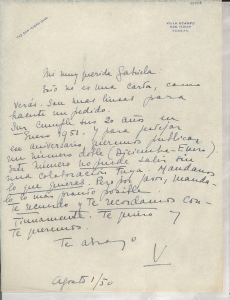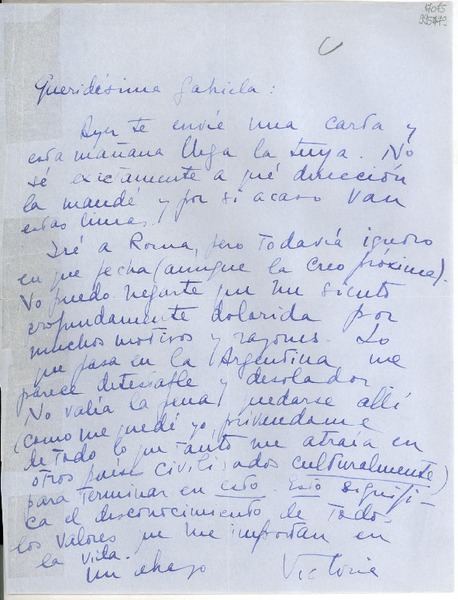 [Carta] [a] Queridísima Gabriela [manuscrito] Victoria [Ocampo].