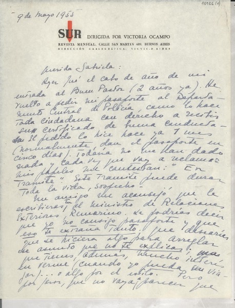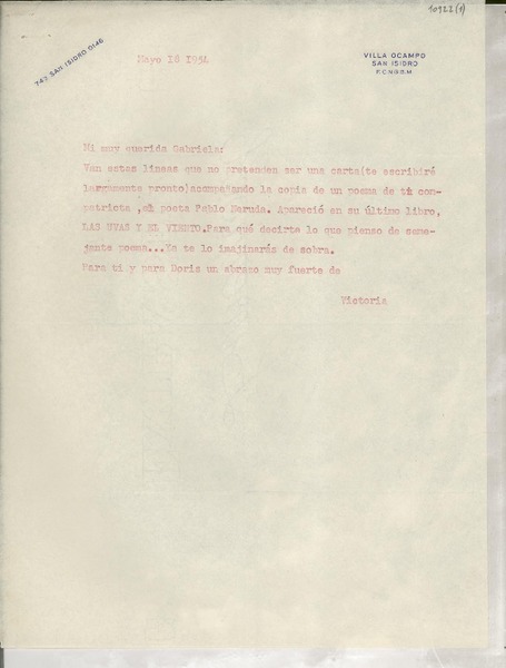 [Carta] 1955 mayo 9, [Buenos Aires], [Argentina] [a] Gabriela [Mistral] [manuscrito] Victoria [Ocampo].