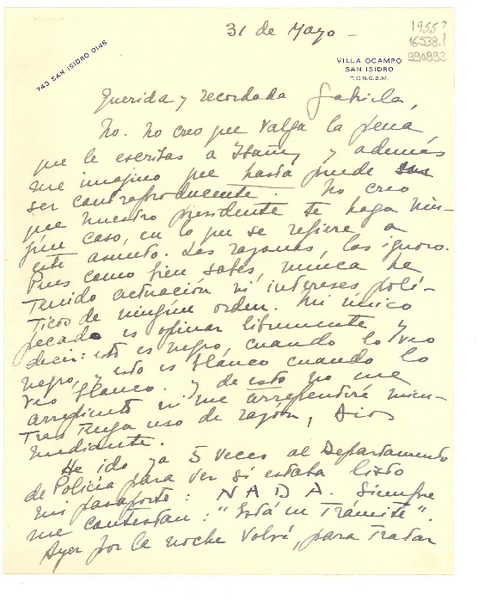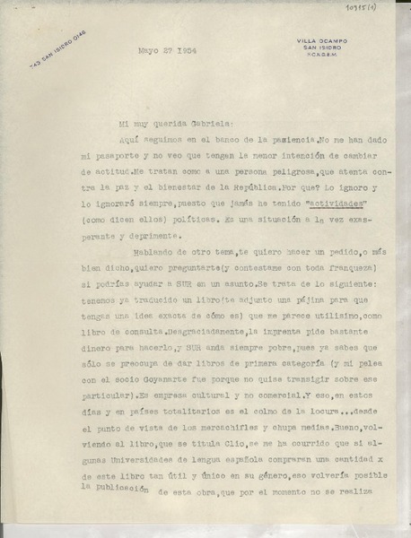 [Carta] 1955 mayo 31, [San Isidro, Argentina] [a] Querida y recordada Gabriela [manuscrito] Victoria Ocampo.