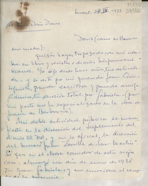 [Carta] 1973 abr. 23, Montevideo, Uruguay [a] Miss Doris Dana [manuscrito] Dora Isella.