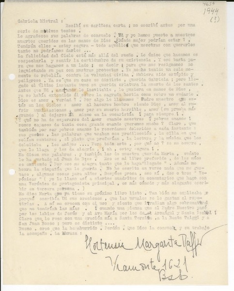 [Carta] [1944], Buenos Aires, [Argentina] [a] Gabriela Mistral [manuscrito] Hortensia Margarita Raffo.