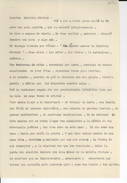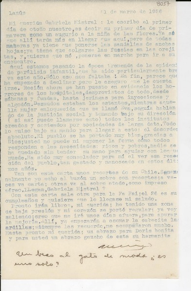 [Carta] 1956 mar. 1, Lanús, [Argentina] [a] Gabriela Mistral [manuscrito] Martha [Salotti].