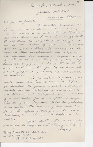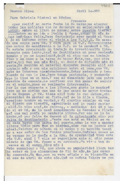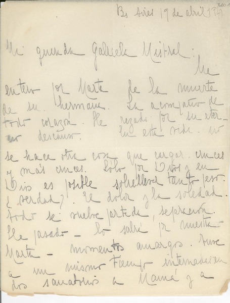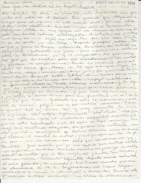[Carta] 1944 abr. 2, Buenos Aires, [Argentina] [a] Gabriela Mistral, Río, [Brasil] [manuscrito] Martha [Salotti].
