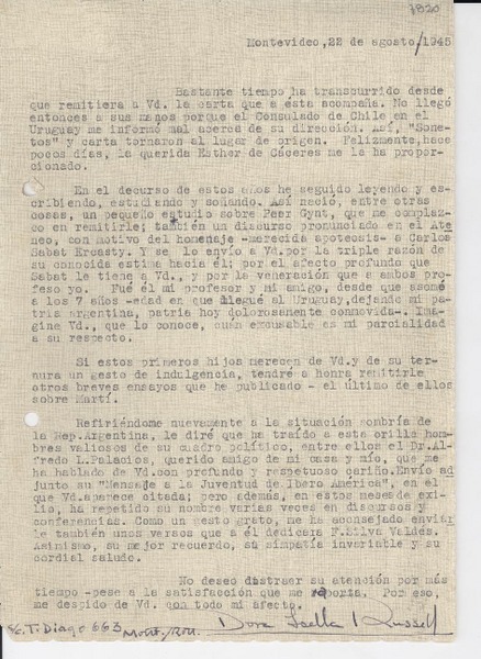 [Carta] 1945 ago. 22, Montevideo, [Uruguay] [a] Gabriela Mistral [manuscrito] Dora Isella Russell.