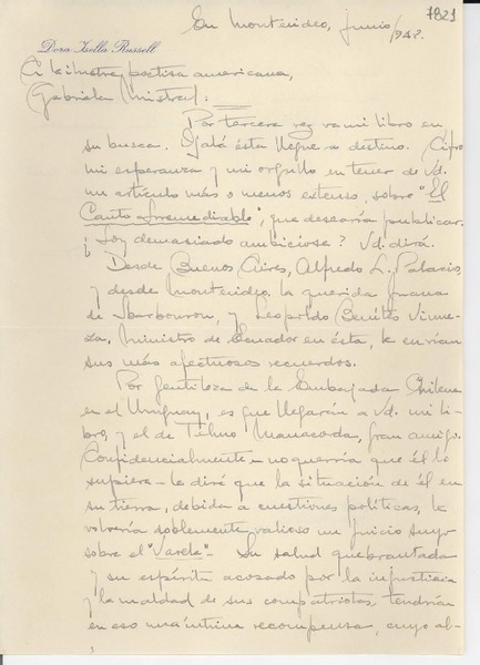 [Carta] 1943 oct., Montevideo, Uruguay [a] Gabriela Mistral [manuscrito] Dora Isella Russell.