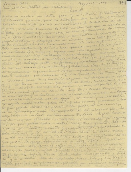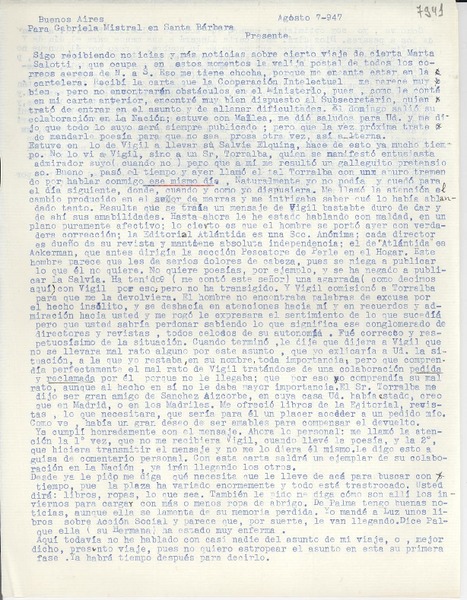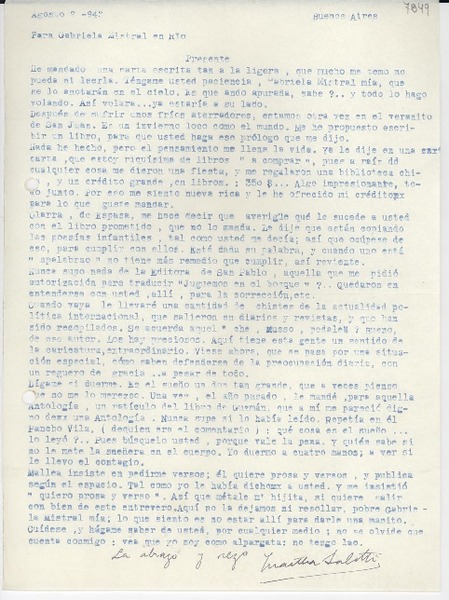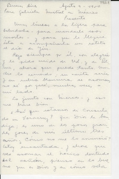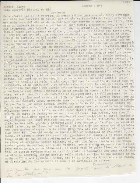 [Carta] 1943 ago. 2, Buenos Aires, [Argentina] [a] Gabriela Mistral, Río, [Brasil] [manuscrito] Martha Salotti.