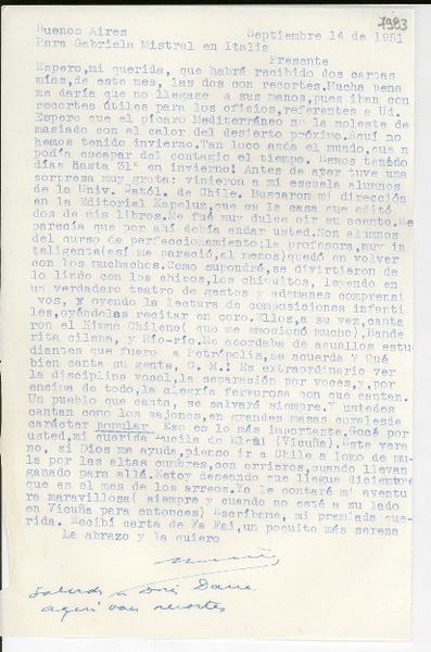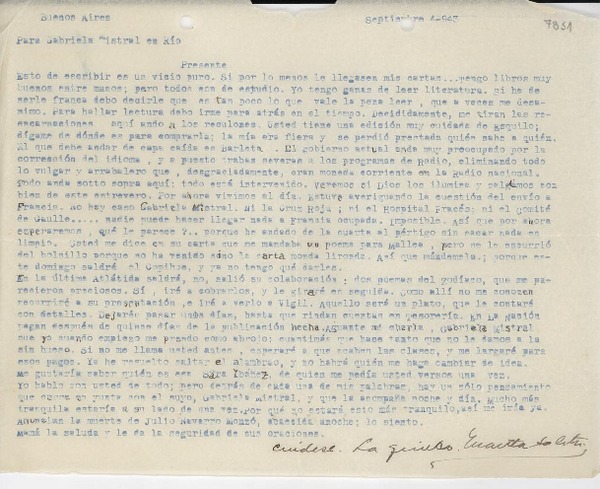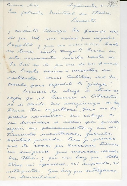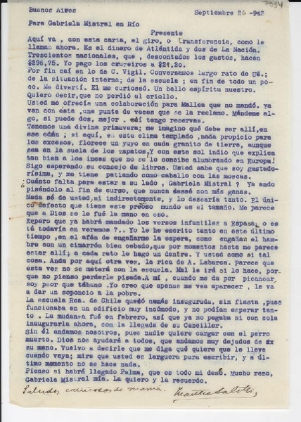 [Carta] 1943 sept., Buenos Aires, [Argentina] [a] Gabriela Mistral, Río, [Brasil] [manuscrito] Martha Salotti.