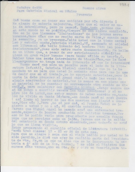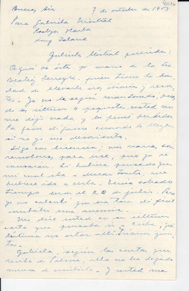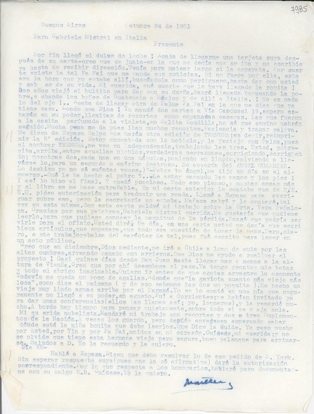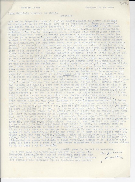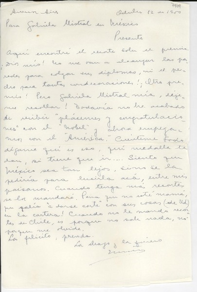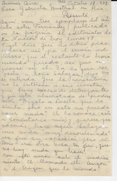 [Carta] 1943 oct. 18, Buenos Aires, [Argentina] [a] Gabriela Mistral, Río [de Janeiro, Brasil] [manuscrito] Martha A. Salotti.
