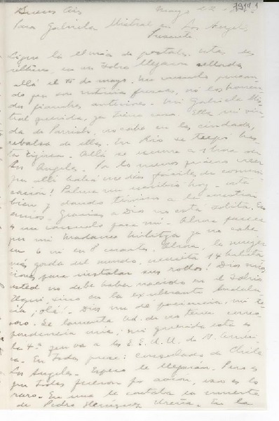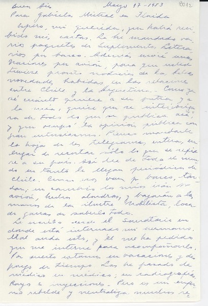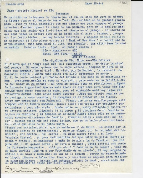 [Carta] 1944 mayo 25, Buenos ires [Aires] , [Argentina] [a] Gabriela Mistral, Rio, [Brasil] [manuscrito] Martha [Salotti].