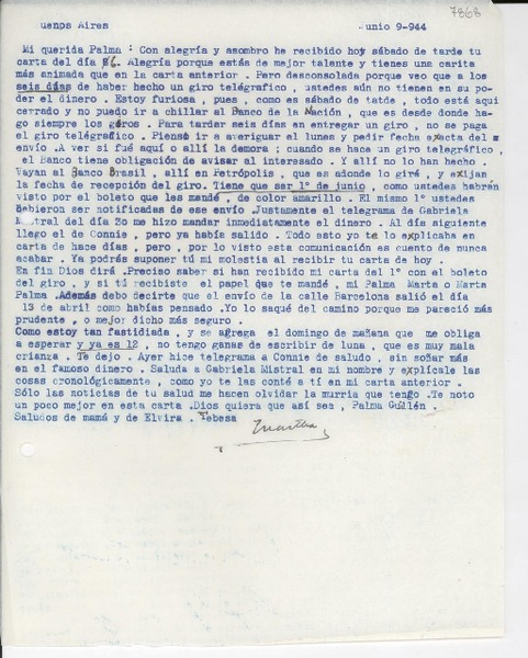 [Carta] 1944 jun. 9, uenos [i.e. Buenos] Aires, [Argentina] [a] Palma [Guillén] [manuscrito] Martha S[alotti].