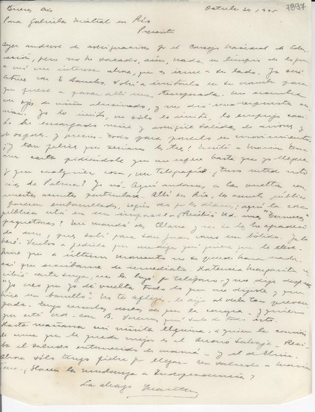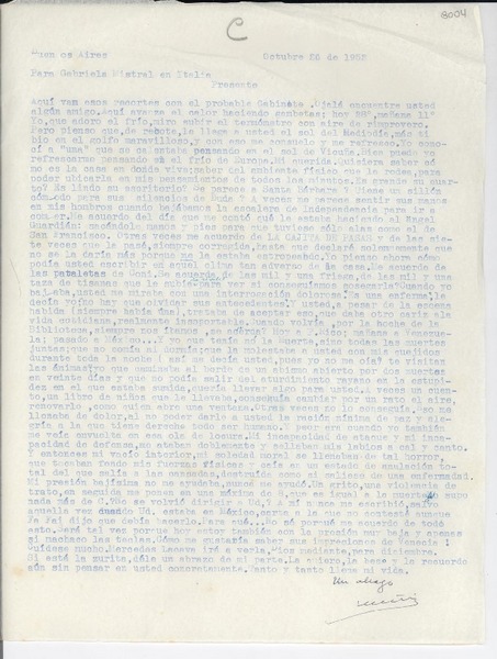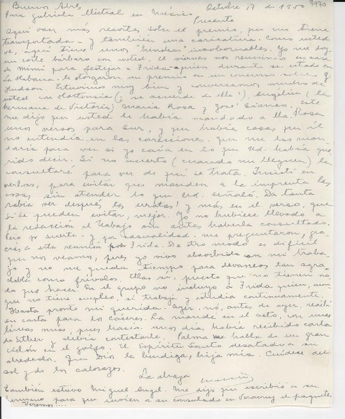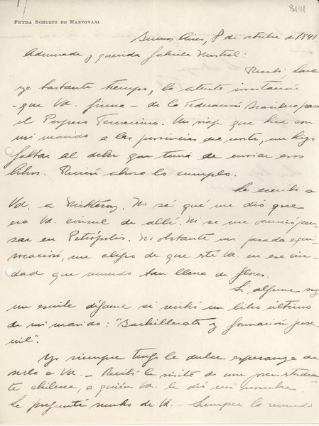 [Carta] 1941 oct. 8, Buenos Aires, [Argentina] [a] Gabriela Mistral [manuscrito] Fryda [Schultz de Montovani].