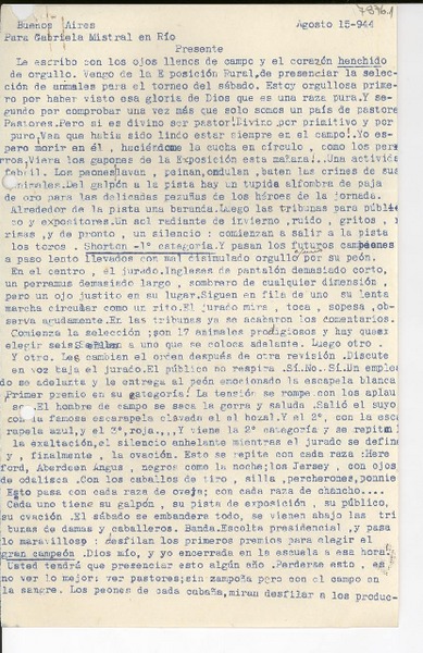 [Carta] 1944 ago. 15, Buenos Aires, [Argentina] [a] Gabriela Mistral, Río, [Brasil] [manuscrito] Martha [Salotti].