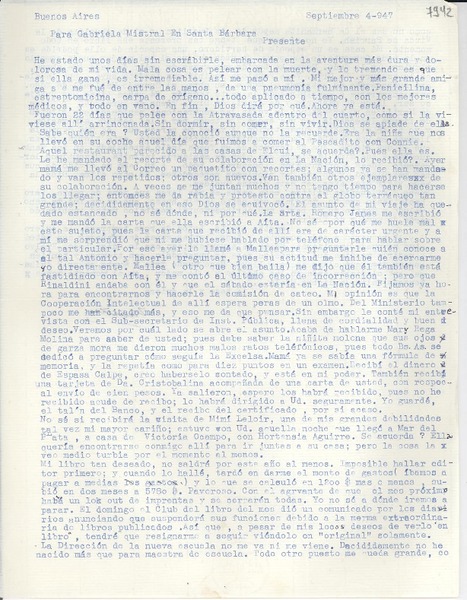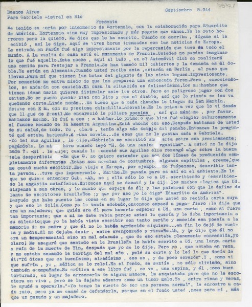 [Carta] 1944 sept. 5, Buenos Aires, [Argentina] [a] Gabriela Mistral, Rio, [Brasil] [manuscrito] Martha [Salotti].