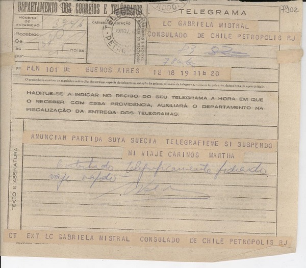 Telegrama [1945 nov. 16], B Aires, Arg. [a] Gabriela Mistral, Consulado Chile Petrópolis, [Brasil] [manuscrito] Ema Risso Platero, Guido Sánchez.