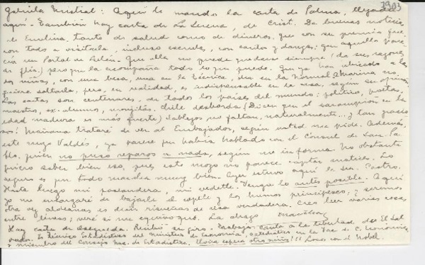 [Carta] [1945, Brasil] [a] Gabriela Mistral [manuscrito] Martha [Salotti].
