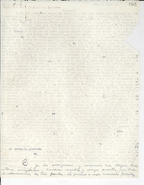 [Carta] 1945 dic. 16, Río de Janeiro [a] Gabriela Mistral, quién sabe dónde [manuscrito] Martha [Salotti].