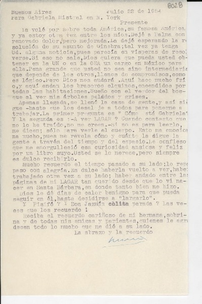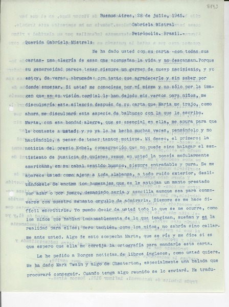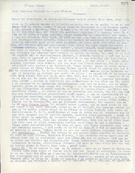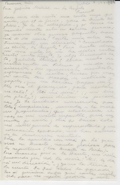 [Carta] [1943] jul. 1, [Buenos Aires] [a] Gabriela Mistral, Río [de Janeiro] [manuscrito] Martha [Salotti].