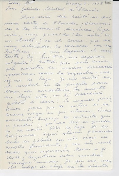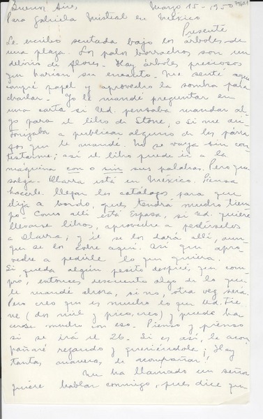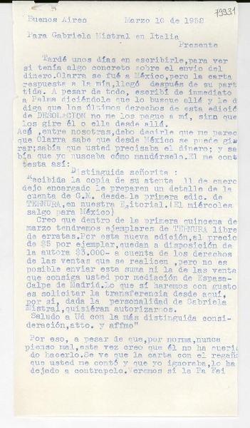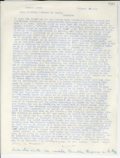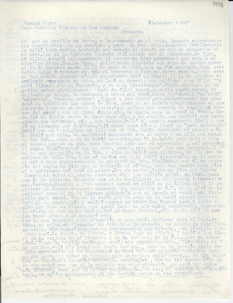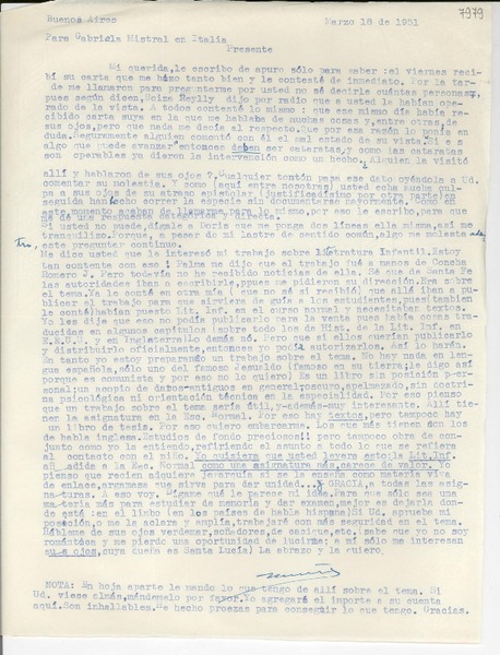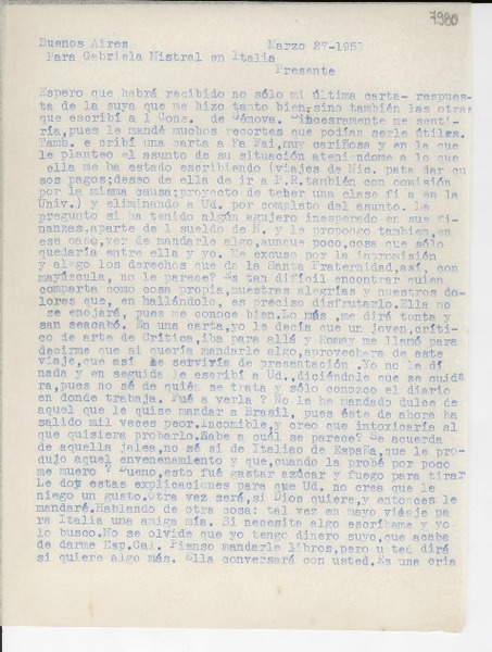 [Carta] 1944 mar. 7, Buenos Aires, [Argentina] [a] Gabriela Mistral, Río, [Brasil] [manuscrito] Martha Salotti.