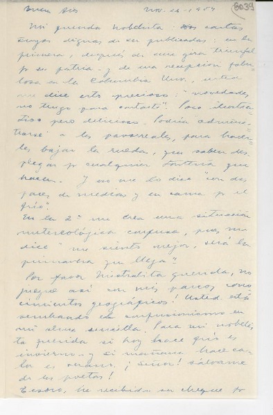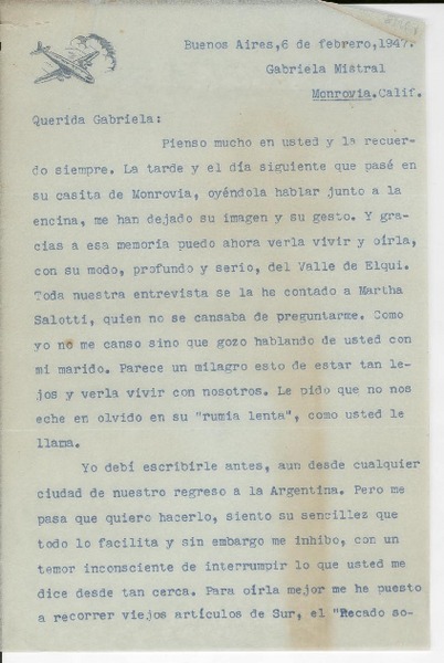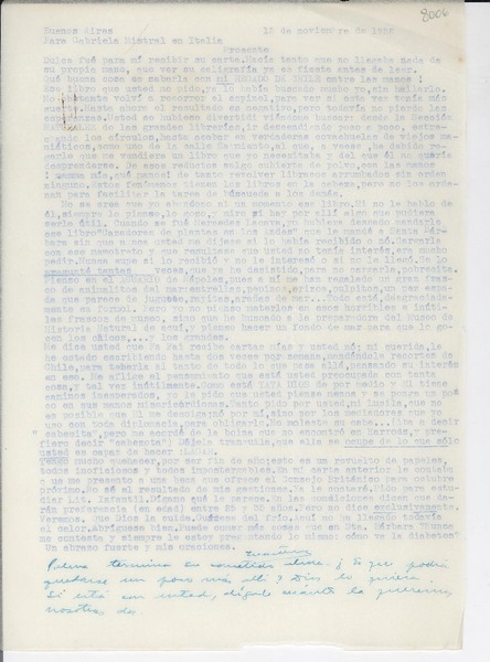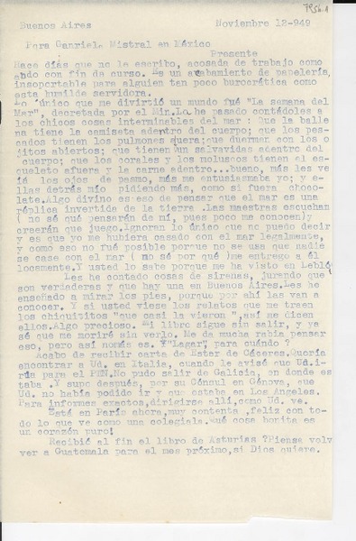 [Carta] 1943 nov. 6, Buenos Aires, [Argentina] [a] Gabriela Mistral, Río, [Brasil] [manuscrito] Martha A. Salotti.