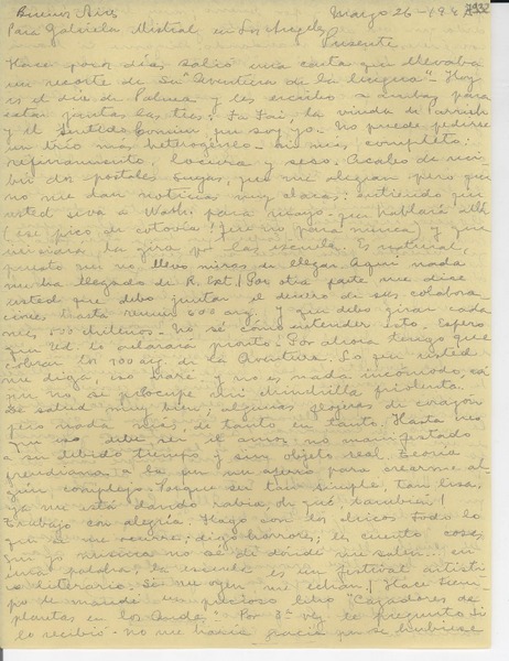 [Carta] 1944 mar. 29, Buenos Aires, [Argentina] [a] Gabriela Mistral [manuscrito] Fryda [Schultz de Montovani].