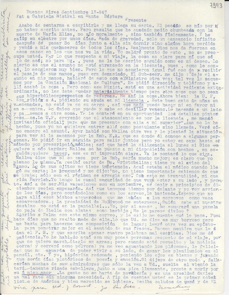 [Carta] 1943 sept. 30, Buenos Aires, [Argentina] [a] Gabriela Mistral, Río, [Brasil] [manuscrito] Martha [Salotti].