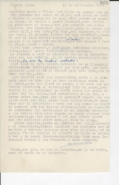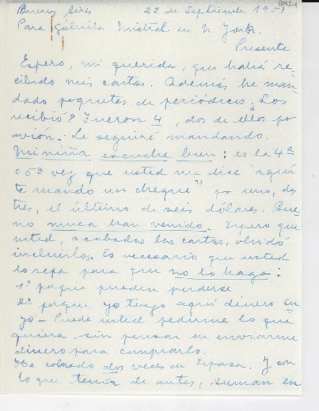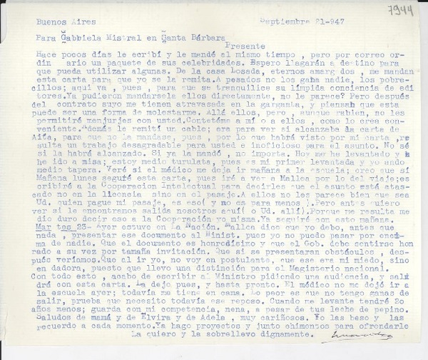 [Carta] 1944 sept. 27, Buenos Aires, [Argentina] [a] Gabriela Mistral, Rio, [Brasil] [manuscrito] Martha [Salotti].