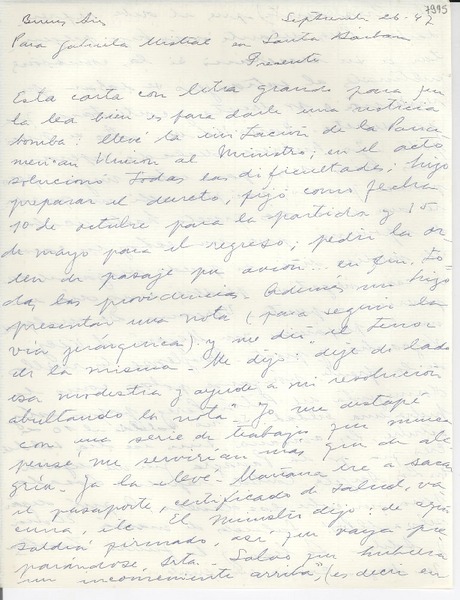[Carta] 1943 sept. 26, Buenos Aires, [Argentina] [a] Gabriela Mistral, Rio, [Brasil] [manuscrito] Martha Salotti.