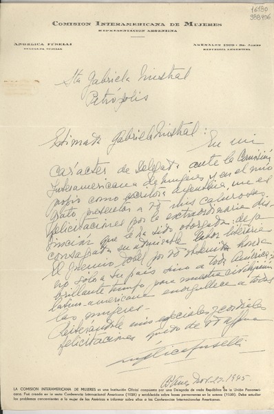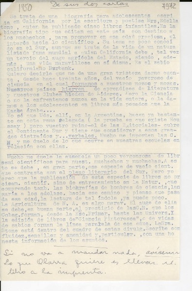 Mistral, Gabriela - Correspondencia - Manuscritos argentinos - Autoras argentinas - Brumana, Herminia C.