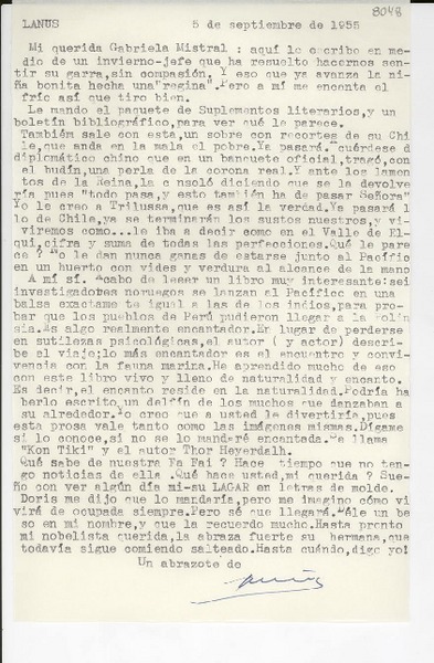 [Carta] 1955 sept. 5, Lanús, [Argentina] [a] Gabriela Mistral [manuscrito] Martha S[alotti].