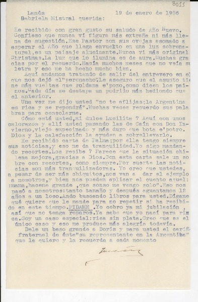 [Carta] 1956 ene. 19, Lanús, [Argentina] [a] Gabriela Mistral [manuscrito] Martha [Salotti].
