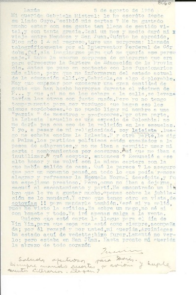 [Carta] 1956 ago. 5, Lanús, [Argentina] [a] Gabriela Mistral [manuscrito] Martha [Salotti].