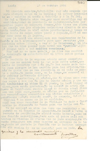 [Carta] 1956 oct. 17, Lanús, [Argentina] [a] Gabriela Mistral [manuscrito] Martha [Salotti].