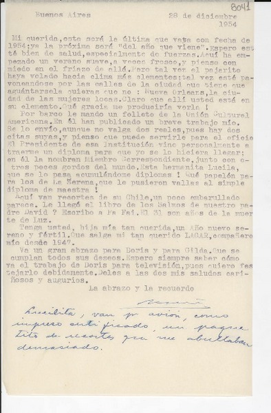 [Carta] 1955 dic. 26, Lanús, [Argentina] [a] Gabriela Mistral [manuscrito] Martha [Salotti].