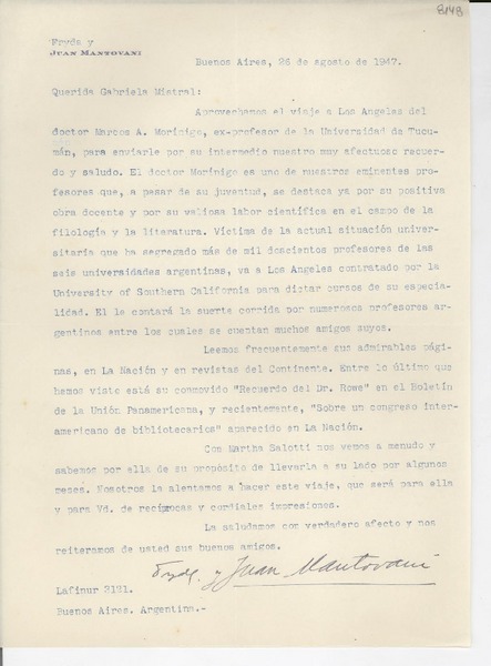 [Carta] 1943 ago. 29, Buenos Aires, [Argentina] [a] Gabriela Mistral, Río, [Brasil] [manuscrito] Martha Salotti.