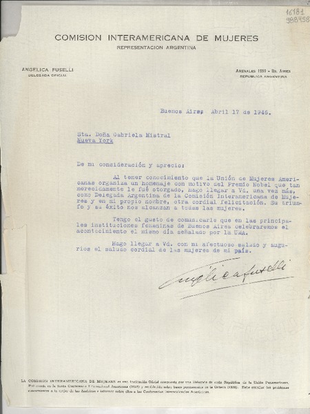 [Carta] 1945 abr. 2, Buenos Aires, [Argentina] [a] Gabriela Mistral, Río [de Janeiro, Brasil] [manuscrito] Martha S[alotti].